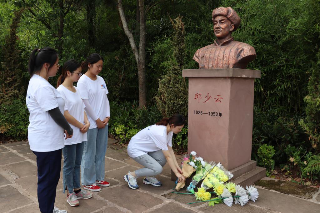 活动中,学生样板支部党员莫静同志结合现场文物、文献、图片,从“苦难的童年”“英雄的成长”“传承与奋进”三方面为大家带来一场情景式主题党课;随后实践团全体成员在故居前挥舞着五星红旗,齐唱红歌《我和我的祖国》,饱含真情的旋律,拨动心弦的歌声,在少云故居前久久回荡;红色经典诵读团以“在烈火中永生”为主题歌颂“对党忠诚、严守纪律、顾全大局、勇于担当”的邱少云精神。缅怀先烈,铭记历史,我们在行动!