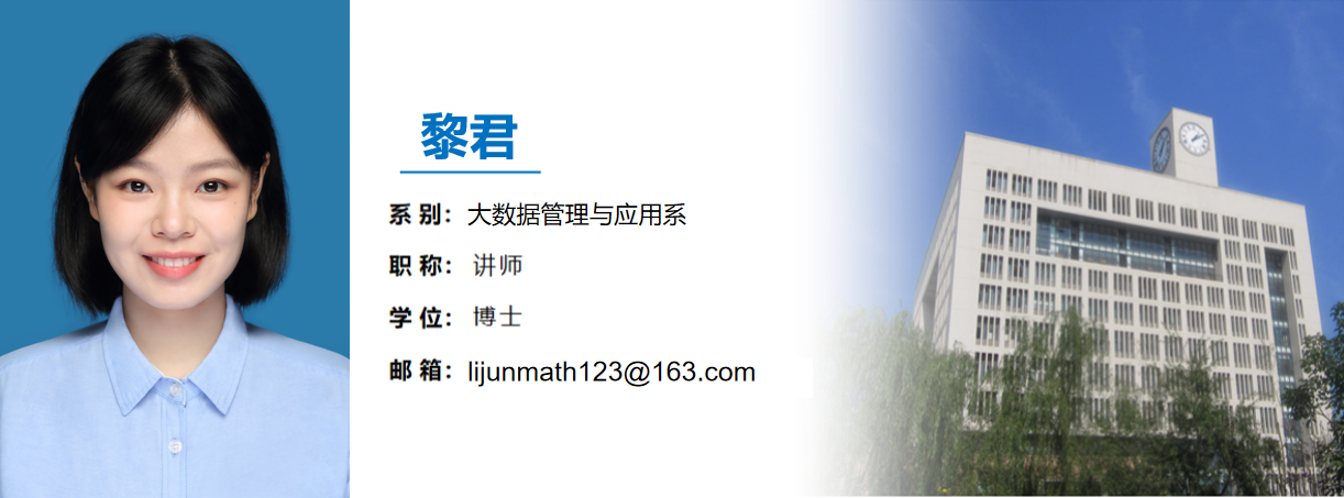黎君,女,汉族,1993年9月,重庆大学工商管理专业博士,讲师,党员。主要研究方向:平台运营管理、智能算法、物流与供应链管理等。主讲大数据技术与应用、数学建模与智能算法、大数据智能分析理论与方法、R语言与商务数据分析等课程。作为主研人员参与多项省部级课题,主持一项校级课题。